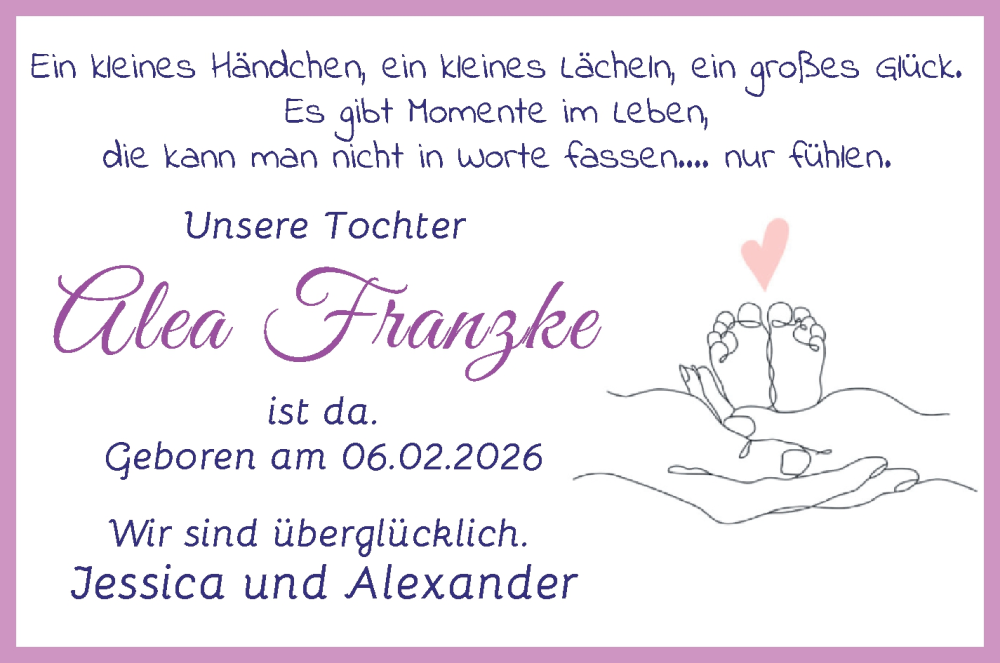 Hier finden Sie alle Familienanzeigen aus der Zeitung, die bisher für Alea Franzke erschienen sind. Weitere Familienanzeigen, die in der Zeitung erscheinen, werden hier ebenfalls aufgelistet