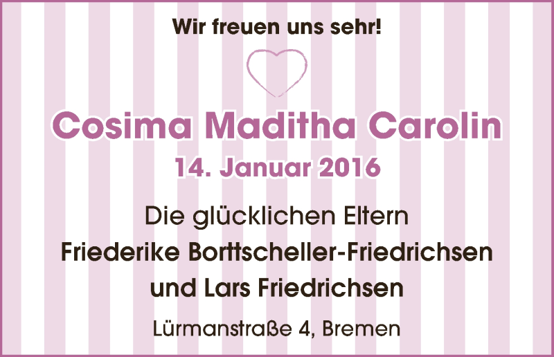 Hier finden Sie alle Familienanzeigen aus der Zeitung, die bisher für Cosima Maditha Carolin erschienen sind. Weitere Familienanzeigen, die in der Zeitung erscheinen, werden hier ebenfalls aufgelistet