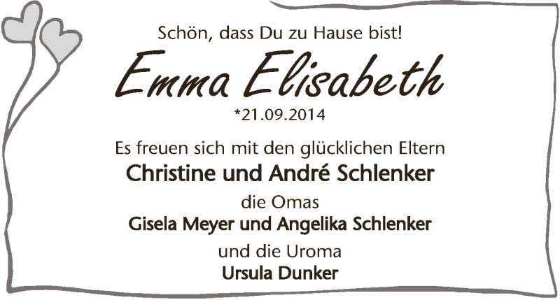 Hier finden Sie alle Familienanzeigen aus der Zeitung, die bisher für Emma Elisabeth Schlenker erschienen sind. Weitere Familienanzeigen, die in der Zeitung erscheinen, werden hier ebenfalls aufgelistet