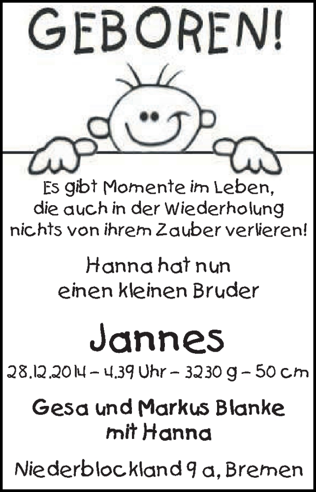Hier finden Sie alle Familienanzeigen aus der Zeitung, die bisher für Jannes Blanke erschienen sind. Weitere Familienanzeigen, die in der Zeitung erscheinen, werden hier ebenfalls aufgelistet