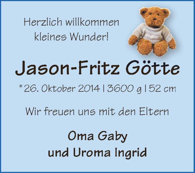 Hier finden Sie alle Familienanzeigen aus der Zeitung, die bisher für Jason-Fritz Götte erschienen sind. Weitere Familienanzeigen, die in der Zeitung erscheinen, werden hier ebenfalls aufgelistet
