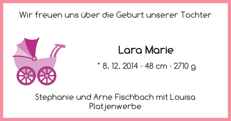 Hier finden Sie alle Familienanzeigen aus der Zeitung, die bisher für Lara Marie Fischbach erschienen sind. Weitere Familienanzeigen, die in der Zeitung erscheinen, werden hier ebenfalls aufgelistet