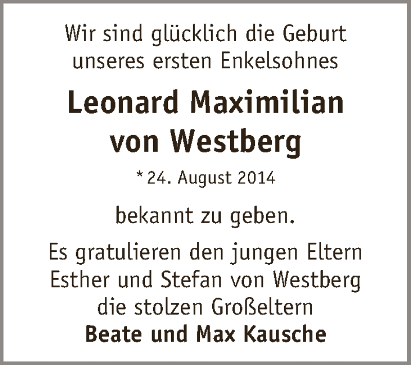 Hier finden Sie alle Familienanzeigen aus der Zeitung, die bisher für Leonard Maximilian von Westberg erschienen sind. Weitere Familienanzeigen, die in der Zeitung erscheinen, werden hier ebenfalls aufgelistet