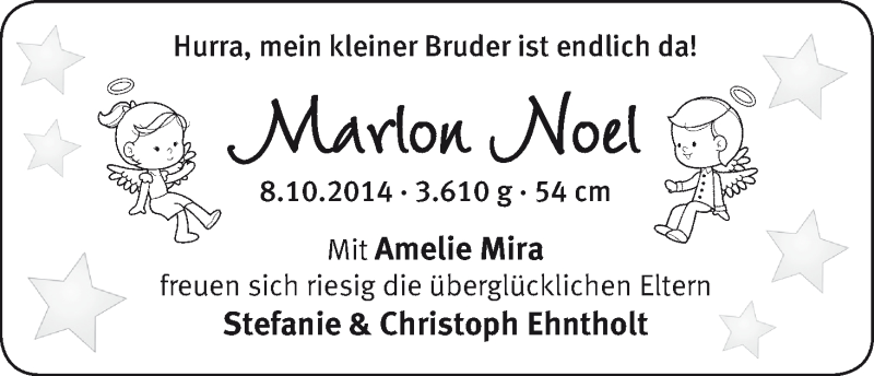 Hier finden Sie alle Familienanzeigen aus der Zeitung, die bisher für Marlon Noel Ehntholt erschienen sind. Weitere Familienanzeigen, die in der Zeitung erscheinen, werden hier ebenfalls aufgelistet