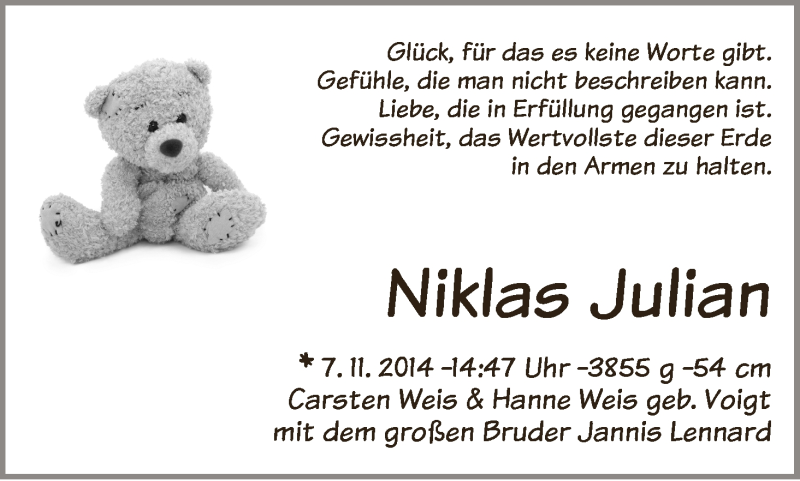 Hier finden Sie alle Familienanzeigen aus der Zeitung, die bisher für Niklas Julian erschienen sind. Weitere Familienanzeigen, die in der Zeitung erscheinen, werden hier ebenfalls aufgelistet