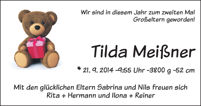 Hier finden Sie alle Familienanzeigen aus der Zeitung, die bisher für Tilda Meißner erschienen sind. Weitere Familienanzeigen, die in der Zeitung erscheinen, werden hier ebenfalls aufgelistet